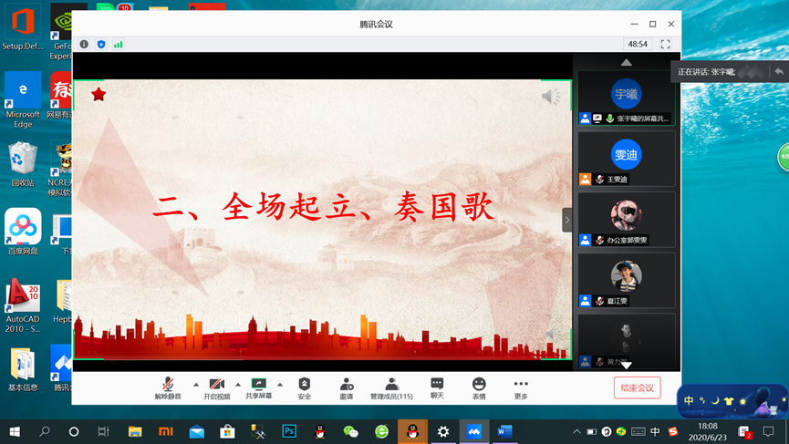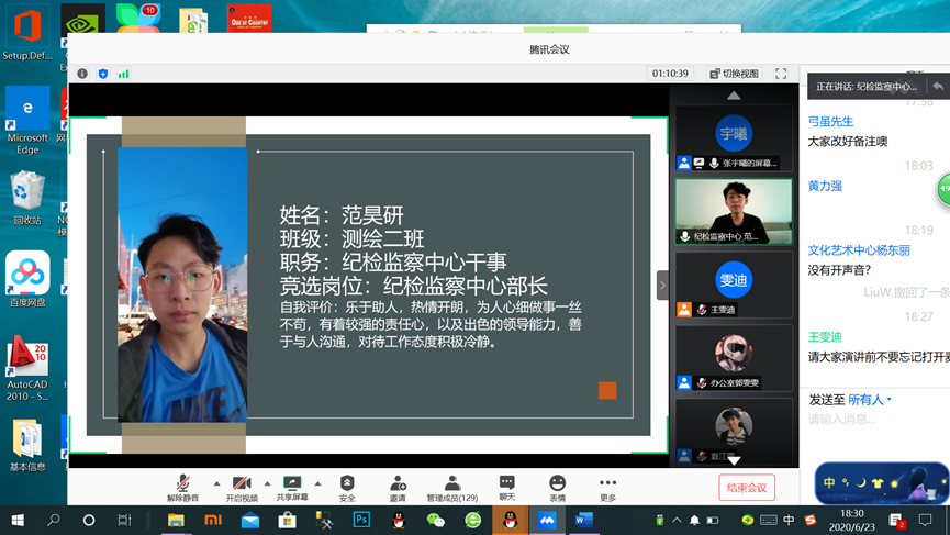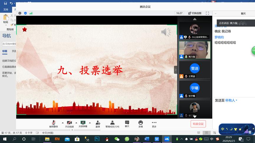 大会伊始,由许东辉老师致开幕词,他表达对员工会成员的殷切期望和对员工干部在工作中的要求,指出员工会是个坚强堡垒,对大家在疫情期间的各种表现给予肯定。在庄严的国歌声中,本次竞选大会正式开始,第一项,由主持人介绍本次大会的竞选职位、竞选流程及注意事项。第二项,分别由现任员工会副主席王坤鹏、现任员工会团总支副书记张志源、现任员工会中心主任曹政清、现任员工会中心主任赵雪宣读候选人资格审查报告、员工代表资格审查报告、大会选举办法以及总监票人、总计票人、监票人、计票人名单,并进行表决。第三项,各位候选人依次进行线上演讲。35位候选人均满怀激情的阐述了自己对工作岗位的认识、竞选原因以及工作设想。第四项,员工代表采用线上投票。第五项,beat365亚洲体育官方网站员工会主席黄力强发言,并表达了对参加竞选大会的同学们的美好的祝福。最后,主持人宣读了第十一届部长团优秀部长及优秀干事名单,本次竞选大会圆满结束。