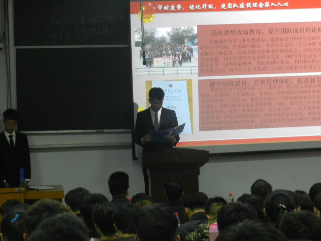 大会在中华人民共和国国歌中拉开帷幕。首先,公司团学办主任许东辉老师致开幕词,许老师肯定上一届员工会的工作,并且鼓励新老干部共同努力,创造更好的明天。首先第九届员工会主席赖祥源作总结报告。接着,常莉老师宣布优秀干部名单。随后,吕鹏飞书记为上一届主席团颁发荣誉证书,并由许东辉老师宣布新一届员工会主席团成员名单。在热烈的掌声中,第十届员工会主席潘聪发表就职演讲。最后,吕鹏飞书记预祝双代会圆满结束。团学办主任许东辉老师致闭幕词,他要求新一届员工会成员团结合作,努力发扬员工会为同学服务的精神,为员工会的发展贡献出自己的力量,努力创造员工会更好的明天。