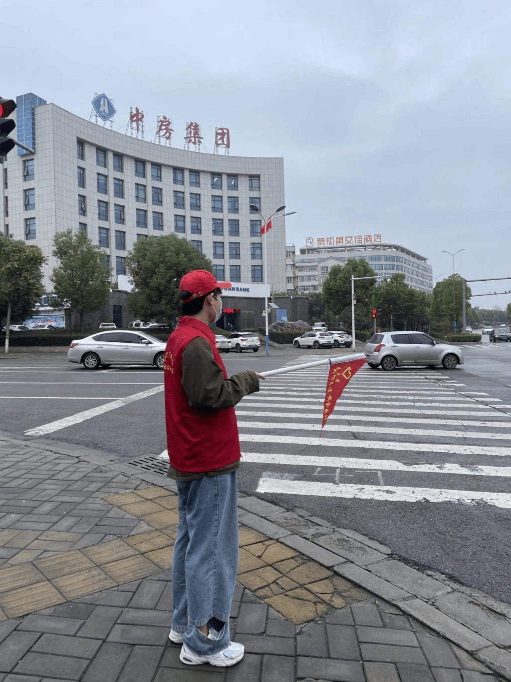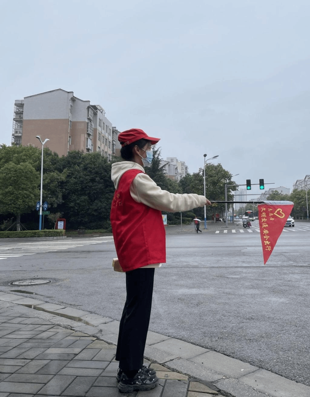 (手持红旗,为过往车辆提示)