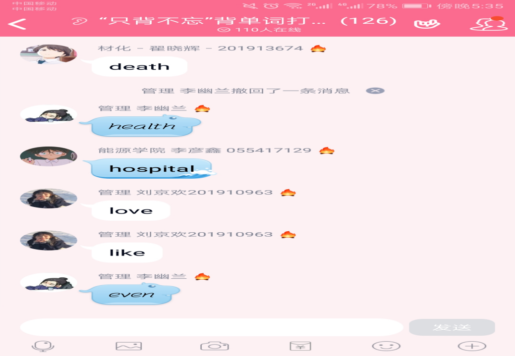 同学们打卡之余的单词接龙互动小游戏