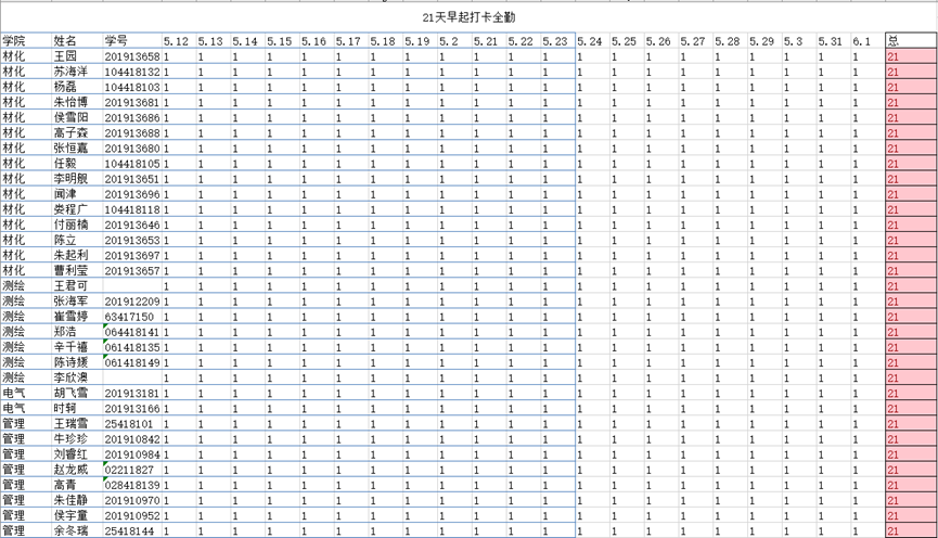 部分全勤打卡同学统计表截图