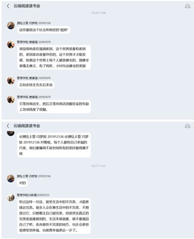本次阅读活动覆盖整个公司,共有48名同学参与,同学们在群内阅读与心理健康有关的电子读物,并积极讨论、分享感悟。活动设立在QQ群线上开展,共推荐了6本心理好书,分别是《被左右的独立思想》、《积极情绪的力量》、《幸福课》、《遇见未知的自己》、《自我分析》和《别装了,其实你没病》。随着线上读书会的进展,同学们明白了读书使人心灵纯净,读书使人胸怀宽广,读书使人睿智涵蓄,充实了同学们的精神生活,提高同学们的精神文明建设,对同学们的未来有着深远的意义!
