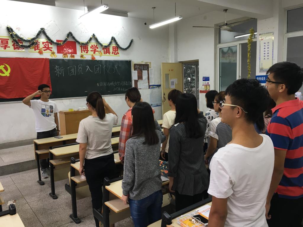 待新团员都入场后,入团仪式在庄严的国歌声中正式开始。首先由主持人宣读了​2017年新团员名单,然后由老团员为新团员们佩戴团徽。随后伴随着雄壮的国歌声,团员们全体起立,面对着鲜红的国旗,庄重地举起右手庄严宣誓。新团员的宣誓慷慨激昂,表现出了他们坚定的信念,此刻的宣誓也将激励团员们在今后的学习、工作及生活中不断进步。最后,在主持人的宣布下入团仪式圆满结束。