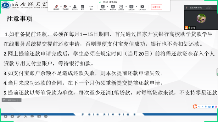 会上,李丹老师主要从贷款展期办理、入伍老员工学费补偿和贷款代偿、毕业确认、还款救助、还款流程以及注意事项等方面进行了详细讲解,并向同学们强调逾期还款对员工自身产生的影响,确保每位员工了解相关征信知识、金融常识和国家助学贷款有关政策规定等。