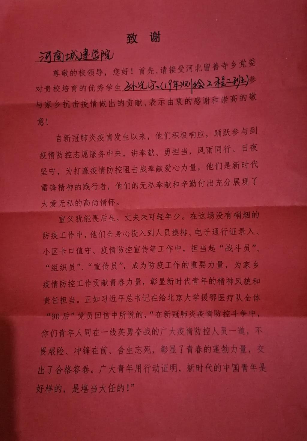 (通讯员 李方圆 陈奥)近日,公司收到一封来自中共河北留善寺乡委员会的感谢信,对beat365亚洲体育官方网站孙光宗同学参与当地抗击疫情做出的贡献,表示由衷的感谢和崇高的敬意。