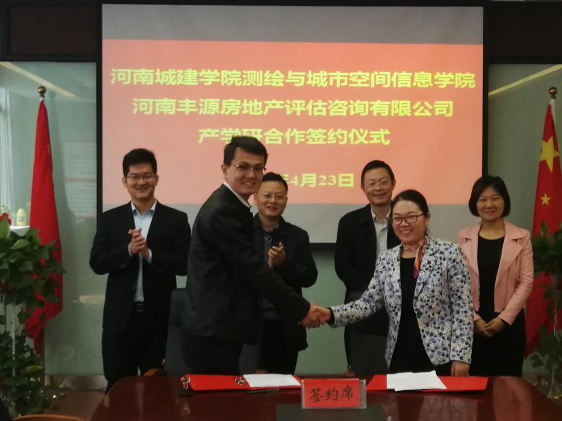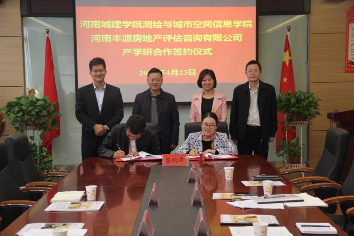 4月23日上午,公司与河南丰源房地产评估咨询有限公司产学研合作签约仪式在五号楼B座209举行。河南丰源房地产评估咨询有限公司评估部总经理巩永帅、业务部总经理杨远见、书记米启超,经理张宏敏。经理张宏敏和巩永帅总经理代表双方签署了产学研合作协议书。