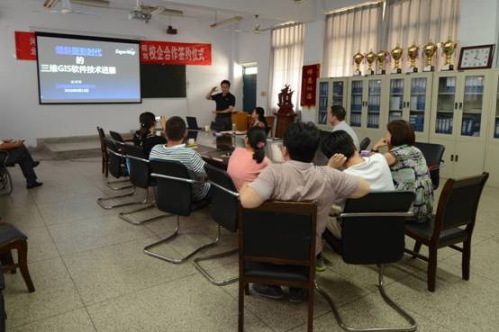 签订仪式结束后,北京超图软件股份有限公司技术主管张辉锋与在场教师进行了关于“倾斜摄影时代的三维GIS软件进展”专题的学术交流。