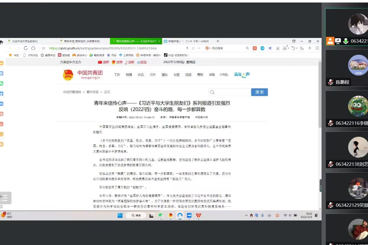 各班团支书为同学们讲解有关总书记与老员工在一起的故事,同学们一起学习习近平总书记写给老员工的来信,仔细阅读,从中感受当代青年的使命与担当。之后同学间畅谈未来,并为自己的未来制定成长计划。