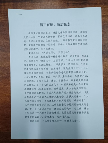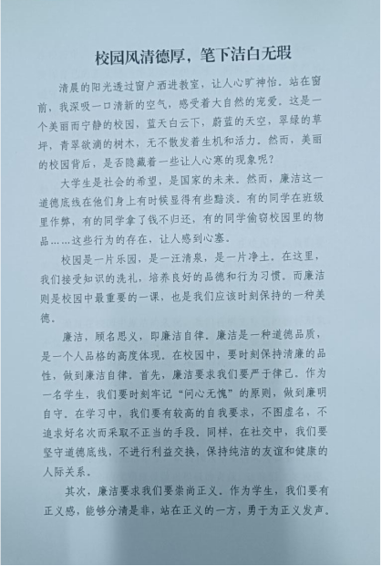 (通讯员:李佳怡)为深入学习贯彻落实党的二十大精神,进一步丰富校园文化生活,营造浓厚的书香校园氛围,弘扬清正廉洁、克己奉公的时代精神,激发员工阅读和写作的热情。2023年10月,beat365亚洲体育官方网站开展了以“清风沐校园,笔下生廉洁”为主题的征文比赛。