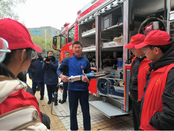 (消防员为参与同学们进行示范和介绍)