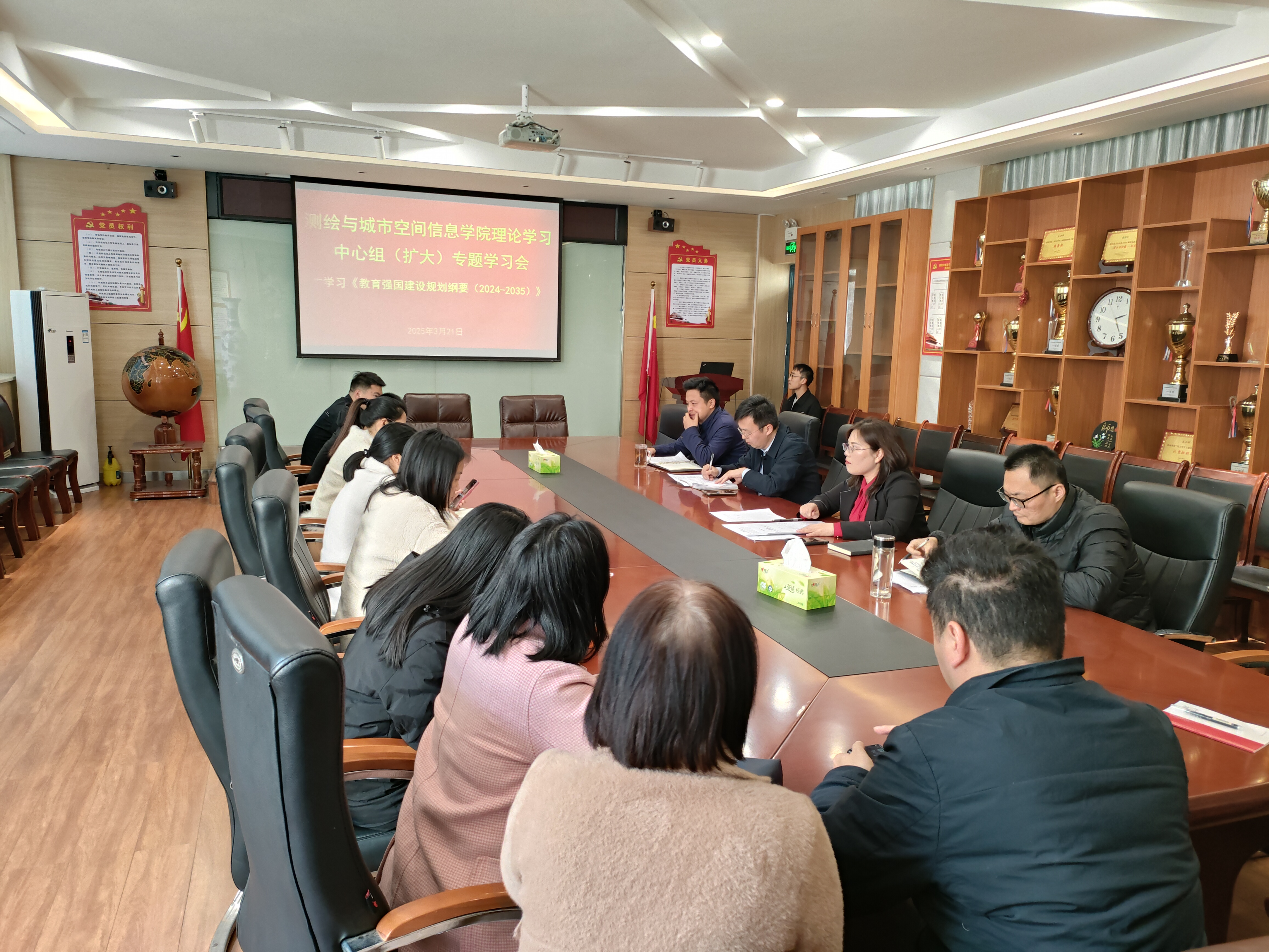 会议强调,一是坚持以习近平新时代中国特色社会主义思想为指导,深入贯彻党的二十大和二十届二中、三中全会,全面贯彻习近平总书记关于教育的重要论述,落实立德树人根本任务,为党育人、为国育才,全面服务中国式现代化建设;二是深入系统学。把学习贯彻《纲要》精神作为当前和今后一个时期的重要任务,我们按照公司党委部署要求,把学习贯彻《纲要》与学习贯彻习近平总书记关于教育的重要论述,引导公司党员干部把思想与行动统一到党中央决策部署上来,为教育强国建设贡献“测绘”力量。三是公司党委要切实扛起政治责任,履行战略使命,找准公司发展定位,强化师生思想政治教育,大力推进党建与业务“双融双促”。